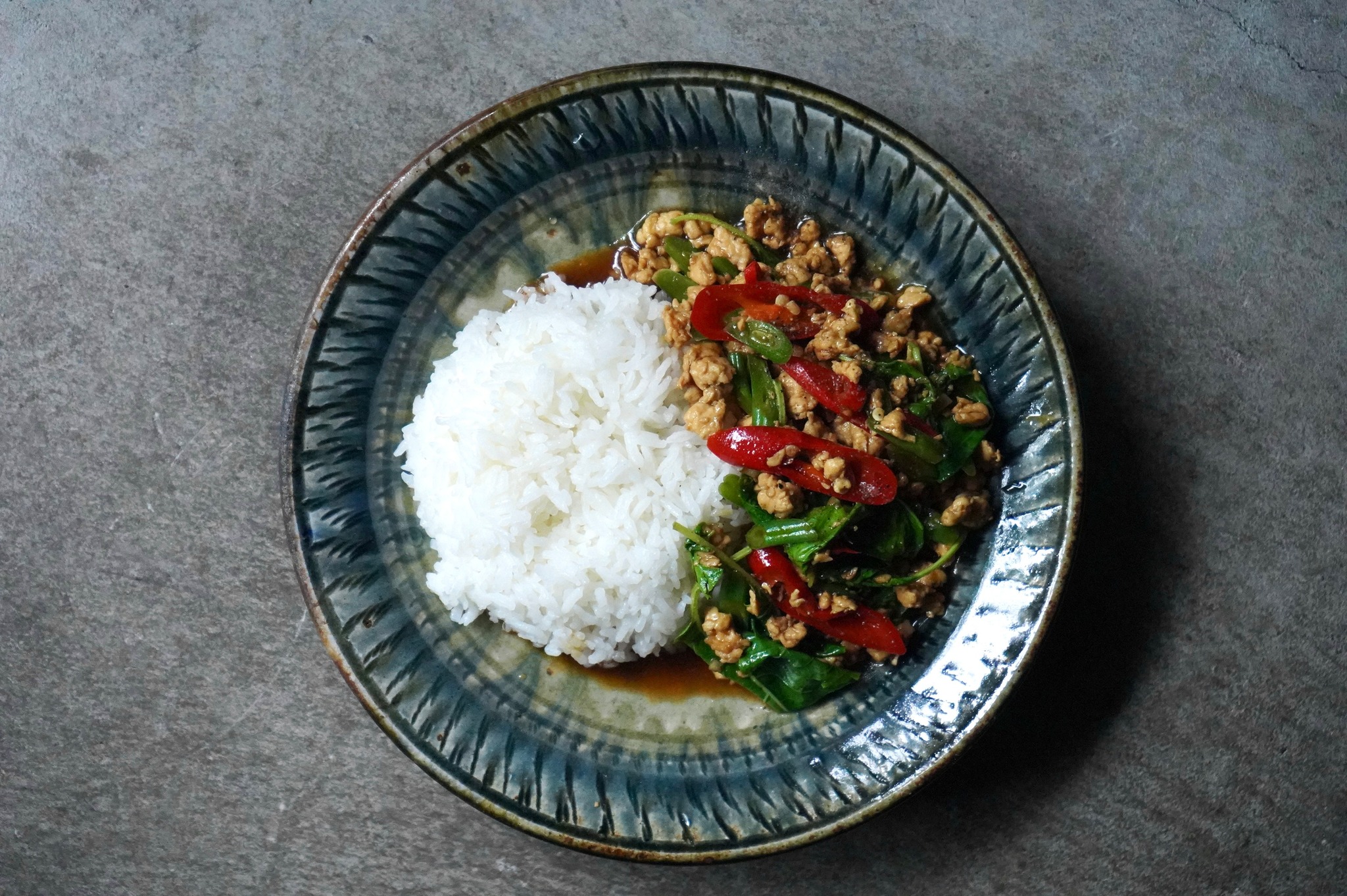・ผัดกะเพราไก่สับราดข้าว(鶏ひき肉のバジル炒めのせごはん)