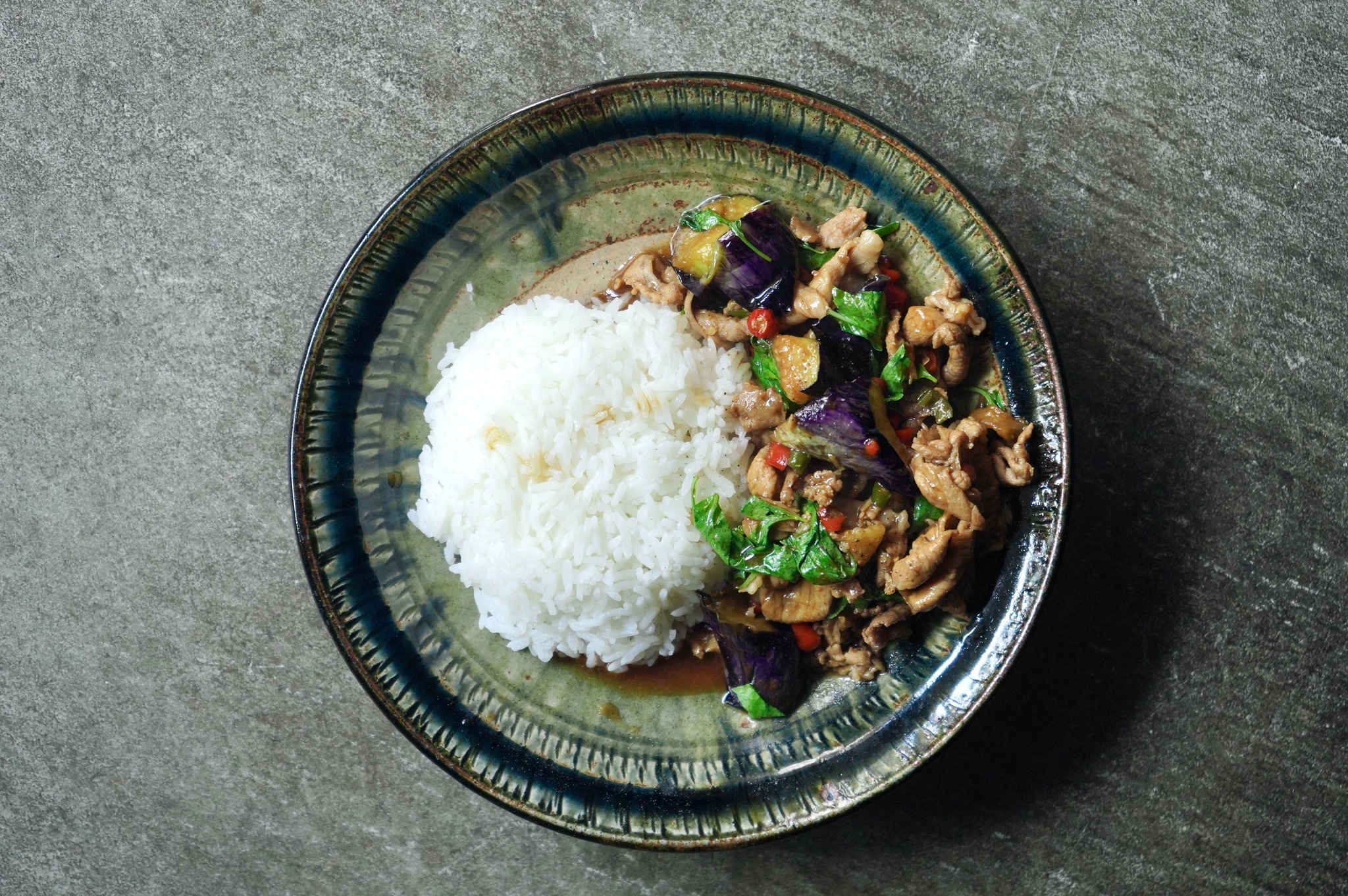 ・ผัดมะเขือราดข้าว(ナスと豚肉のバジル炒めのせごはん)