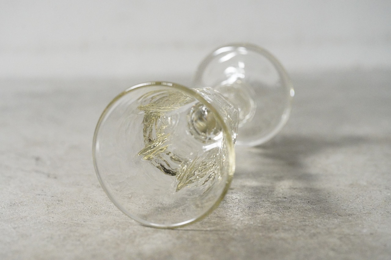 愛媛県、村上恭一さんのワイングラスです。吹きガラス特有のガラスの揺らめきがとても美しいです。晩酌の雰囲気がアガルこと間違いなしです!