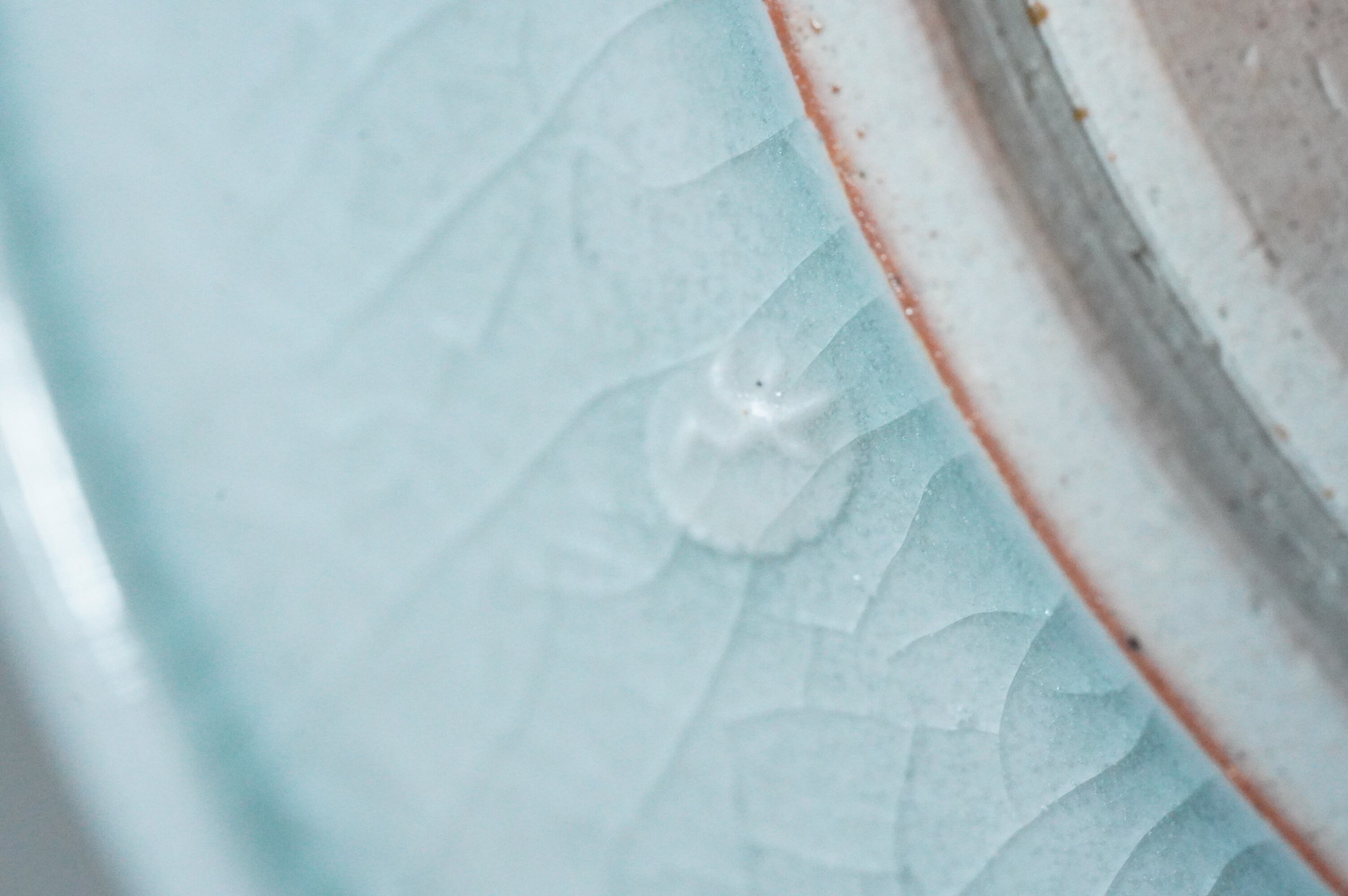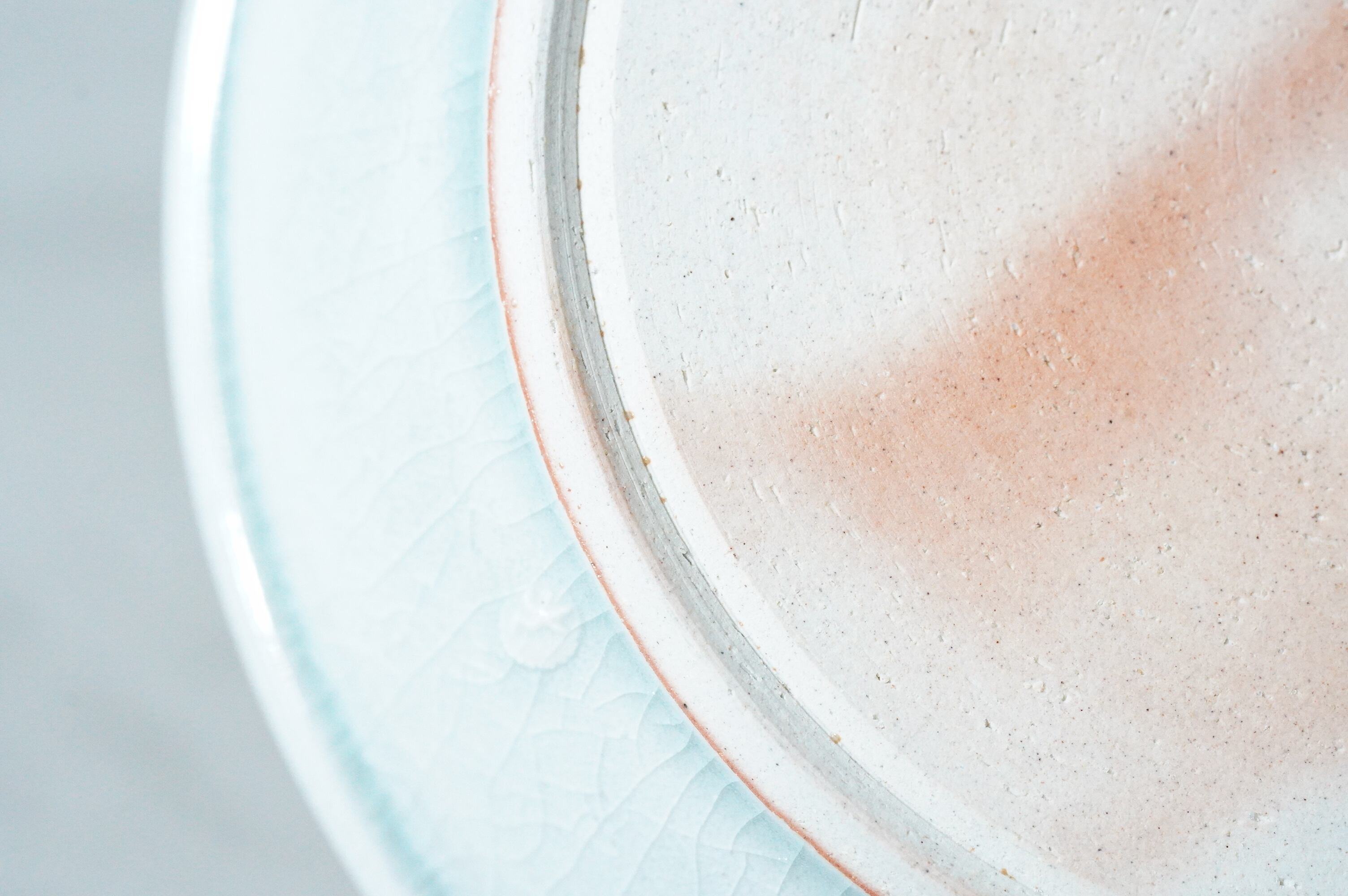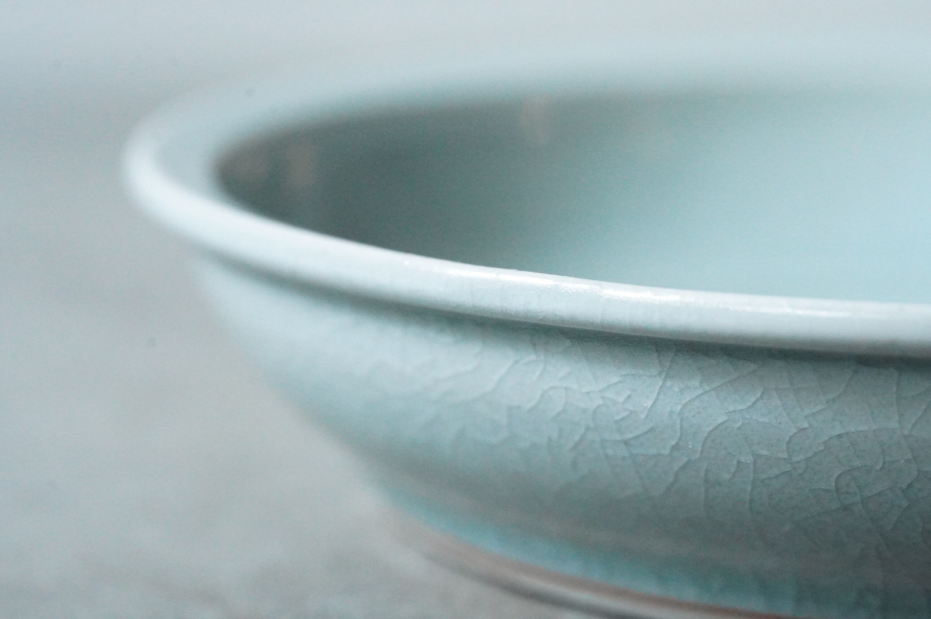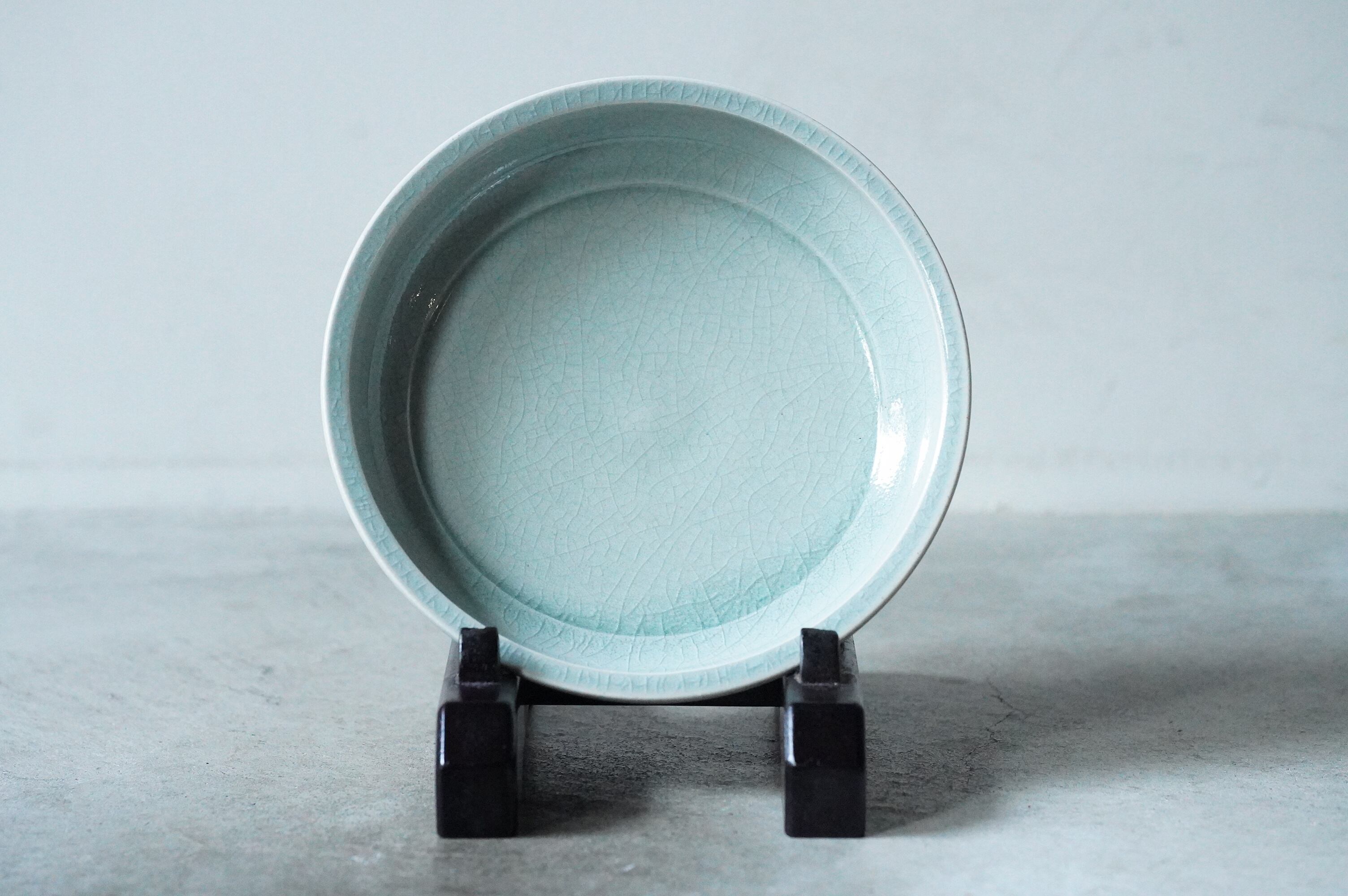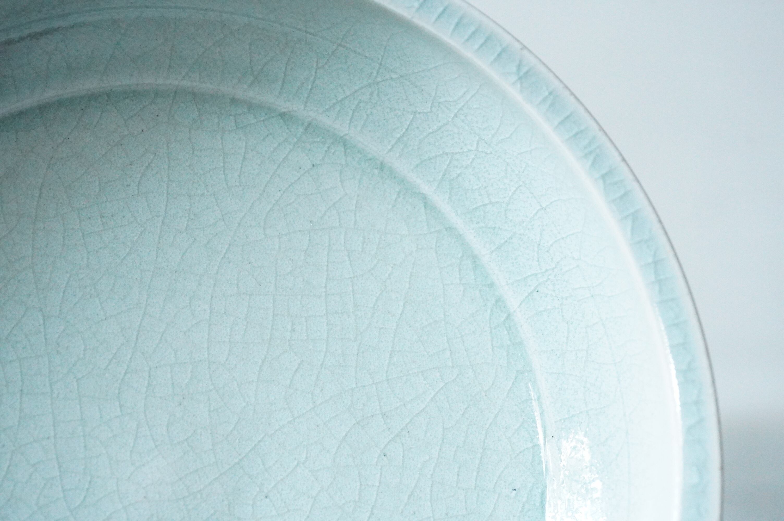 福岡県、風見窯さんの7寸皿です。淡い発色の青磁釉薬が素敵な一枚です。また、貫入の入り方も綺麗です!7寸なのでメイン料理を盛り付けるのにちょうどいいサイズ感です。