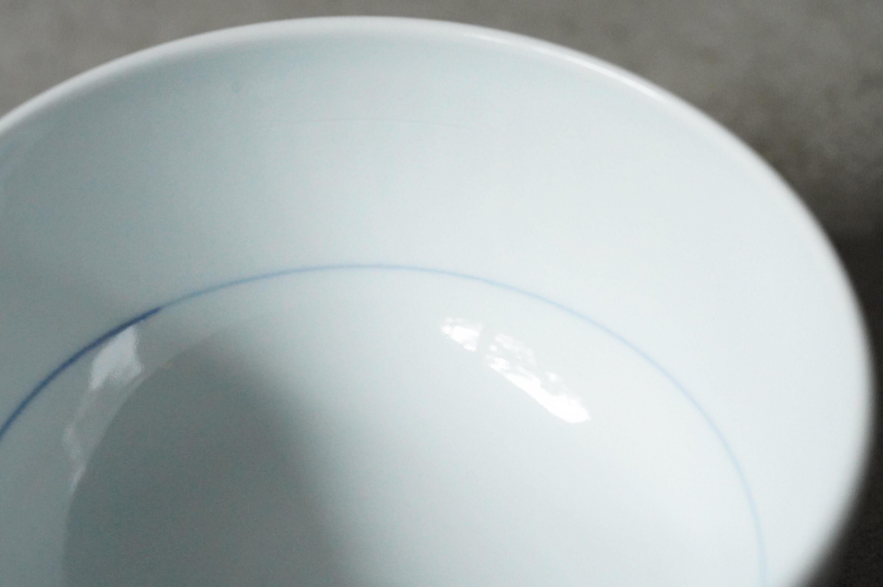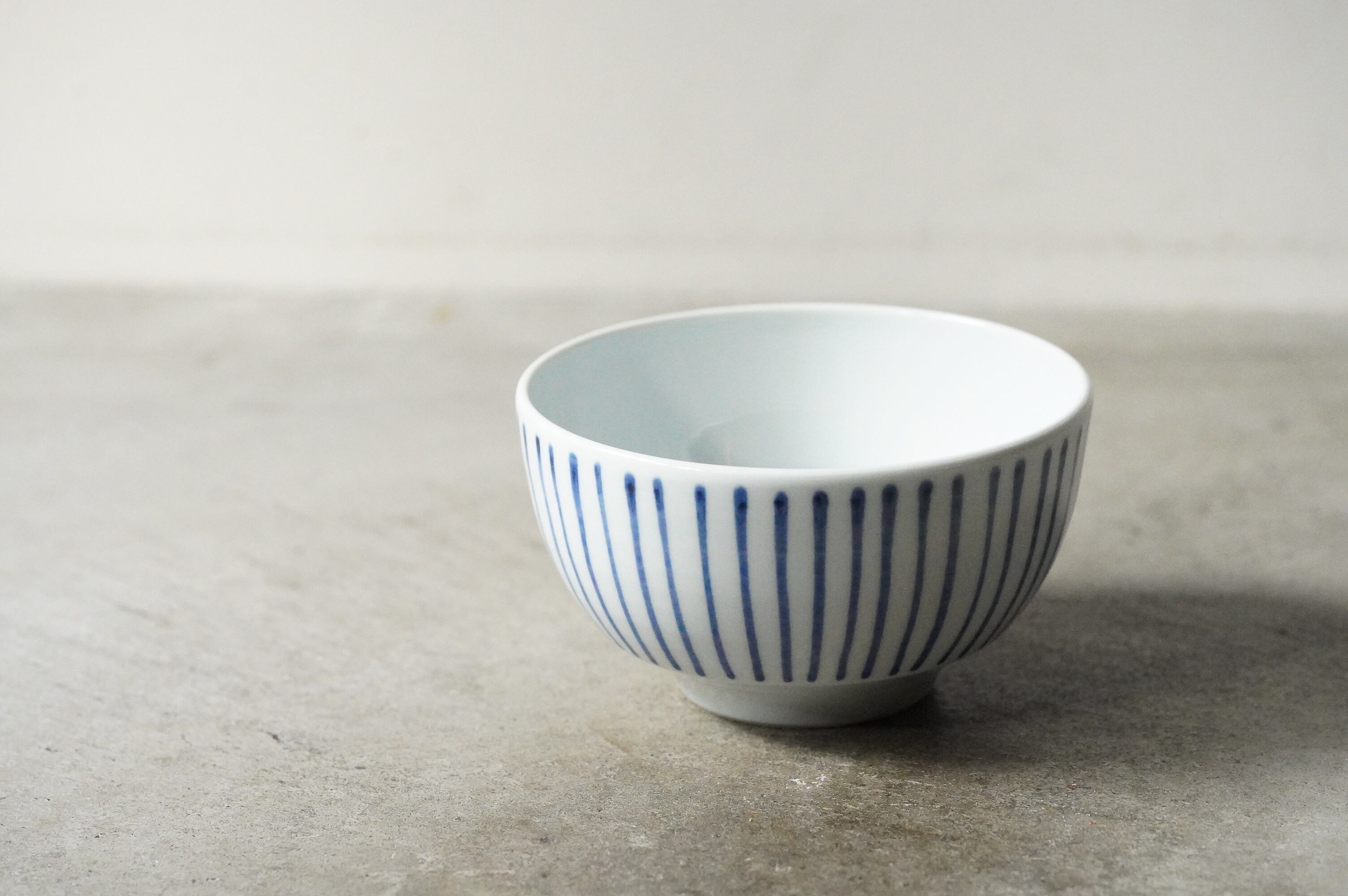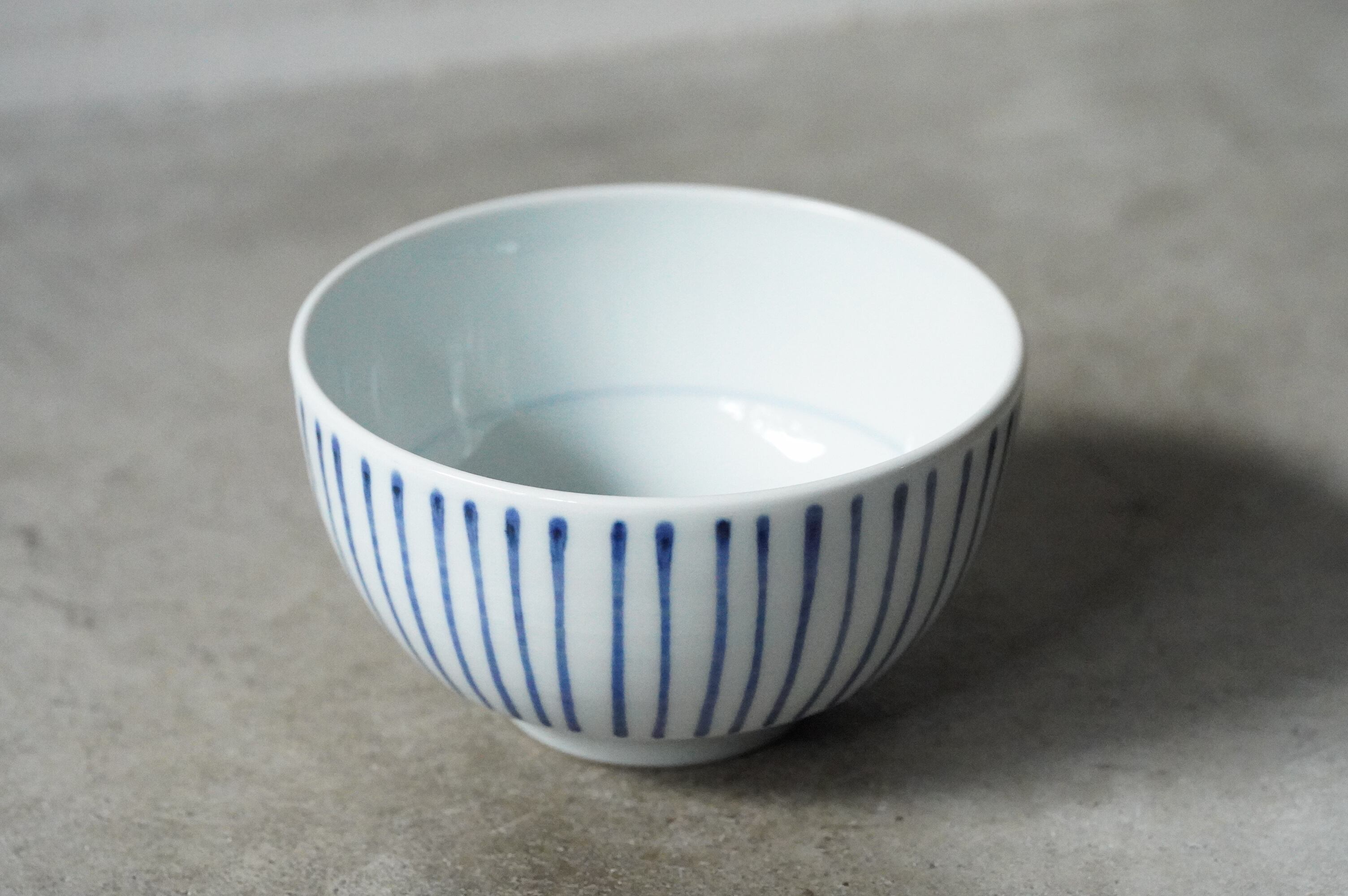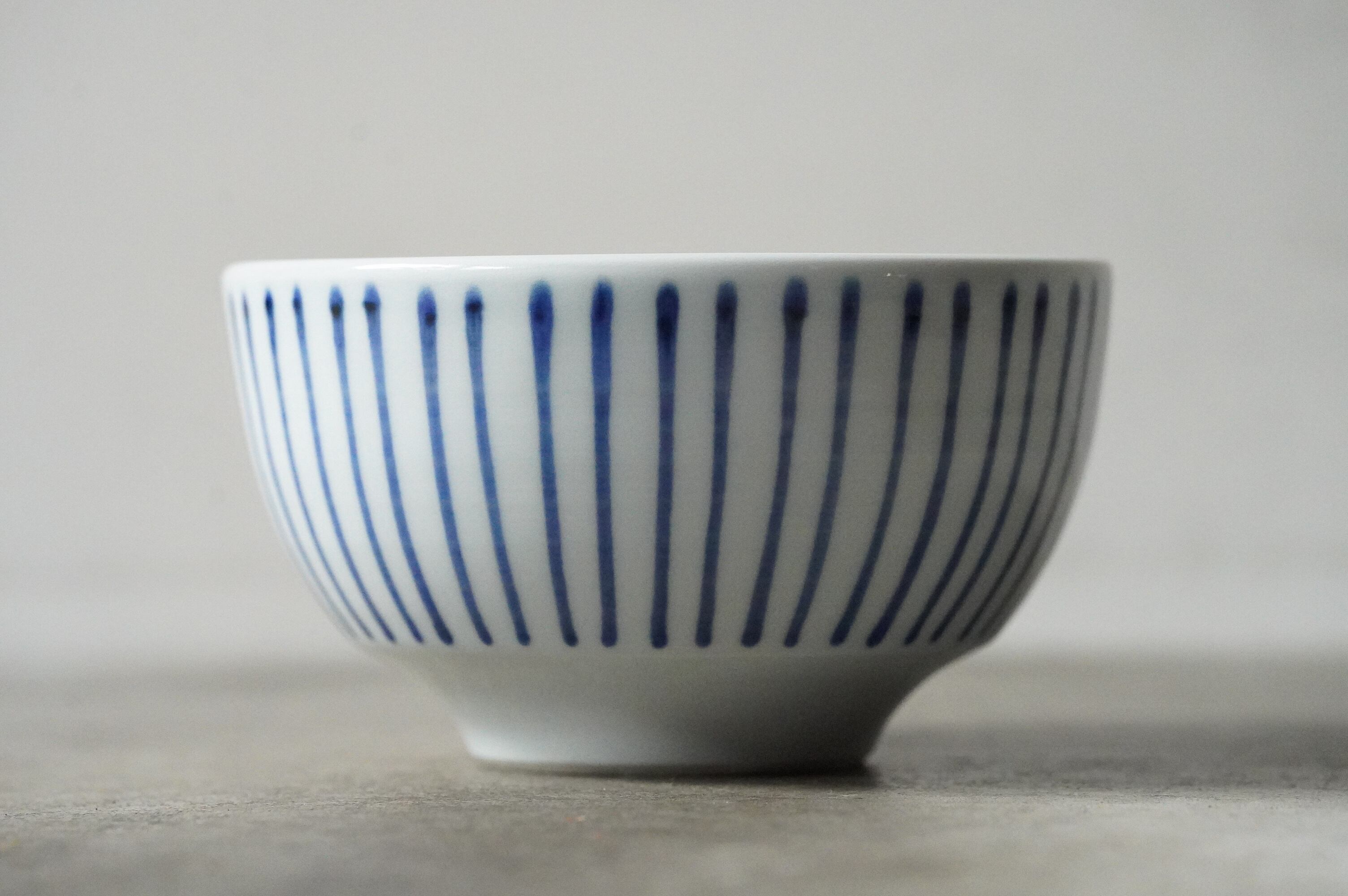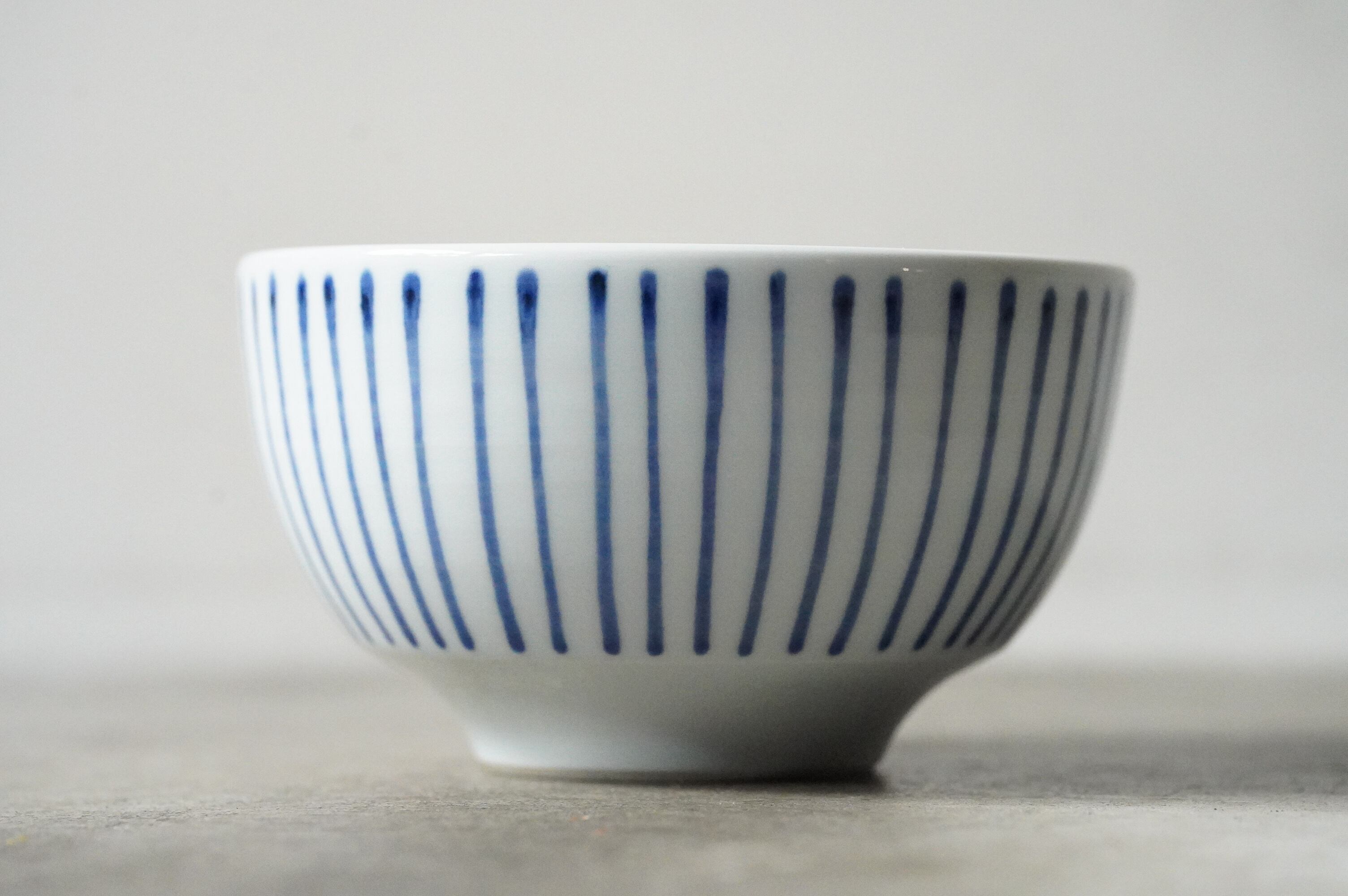 愛媛県の砥部焼、陶房遊さんの麺鉢です。十草文が描かれています。シンプルですが意外に線をまっすぐ一周引いていくのって難しいんです。袋ラーメン1食分がちょうど入るくらいのサイズ感です。磁器特有の扱いやすさもあります。