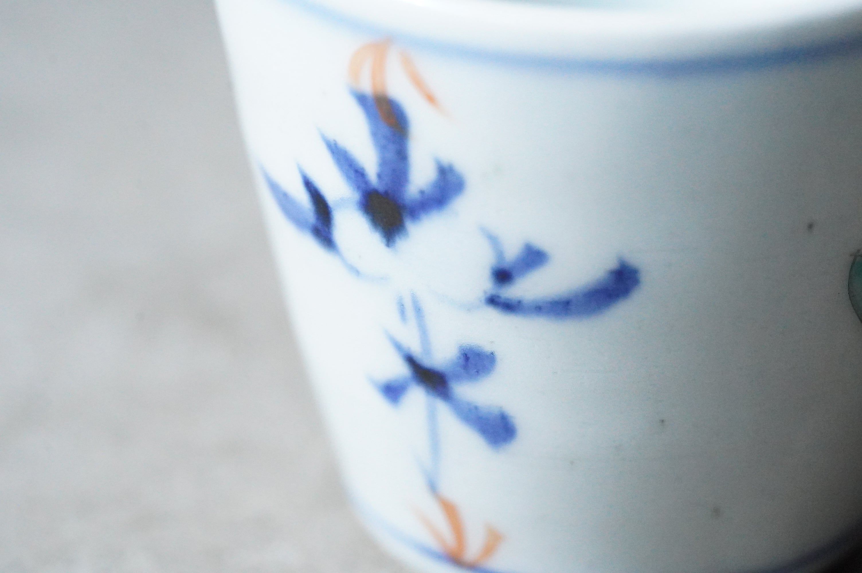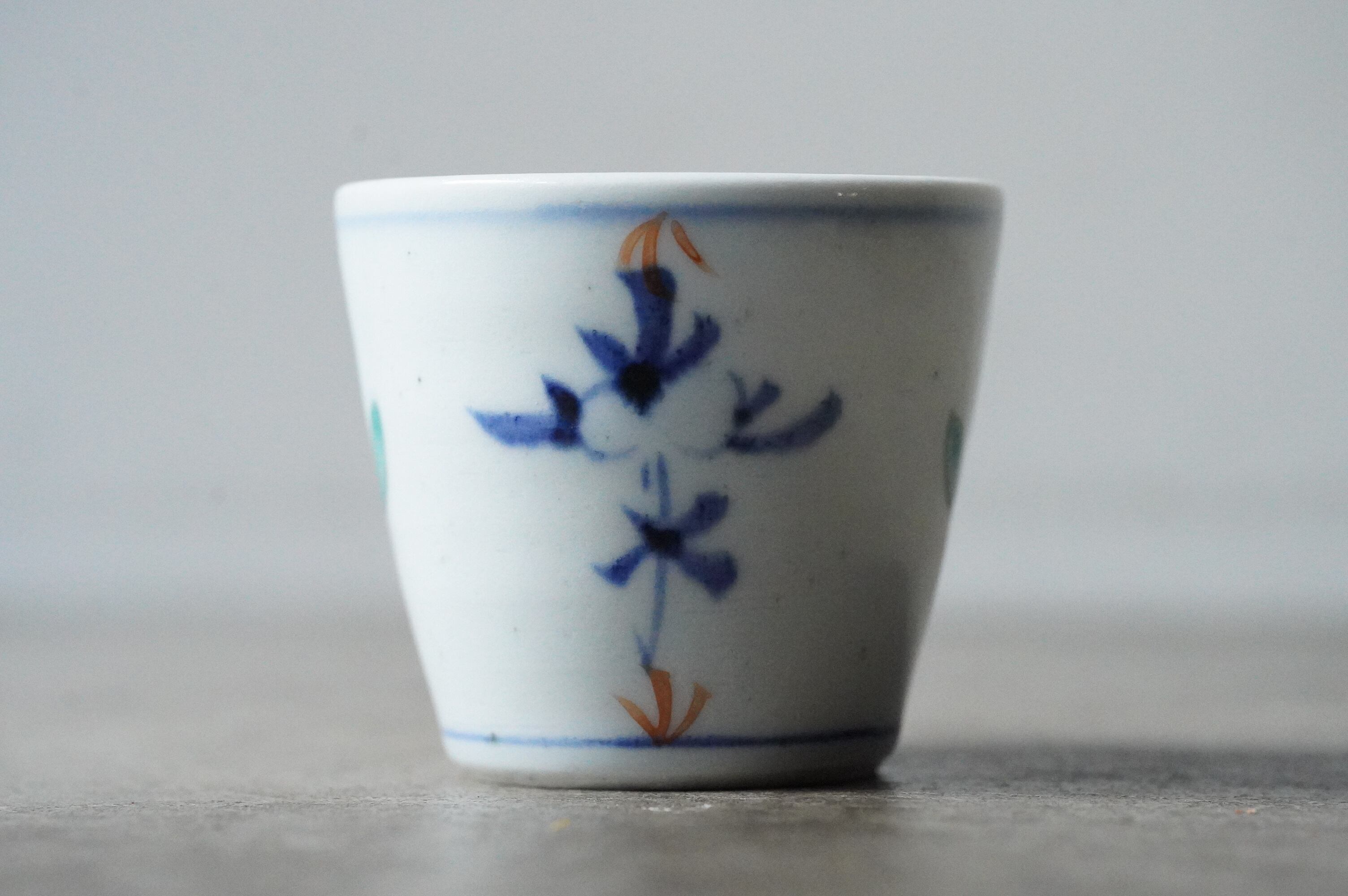 愛媛県の砥部焼、陶房遊さんの蕎麦猪口です。花散らし文様の色使いが私好みです。蕎麦猪口としてはもちろん、お冷コップとしても使いやすいです。