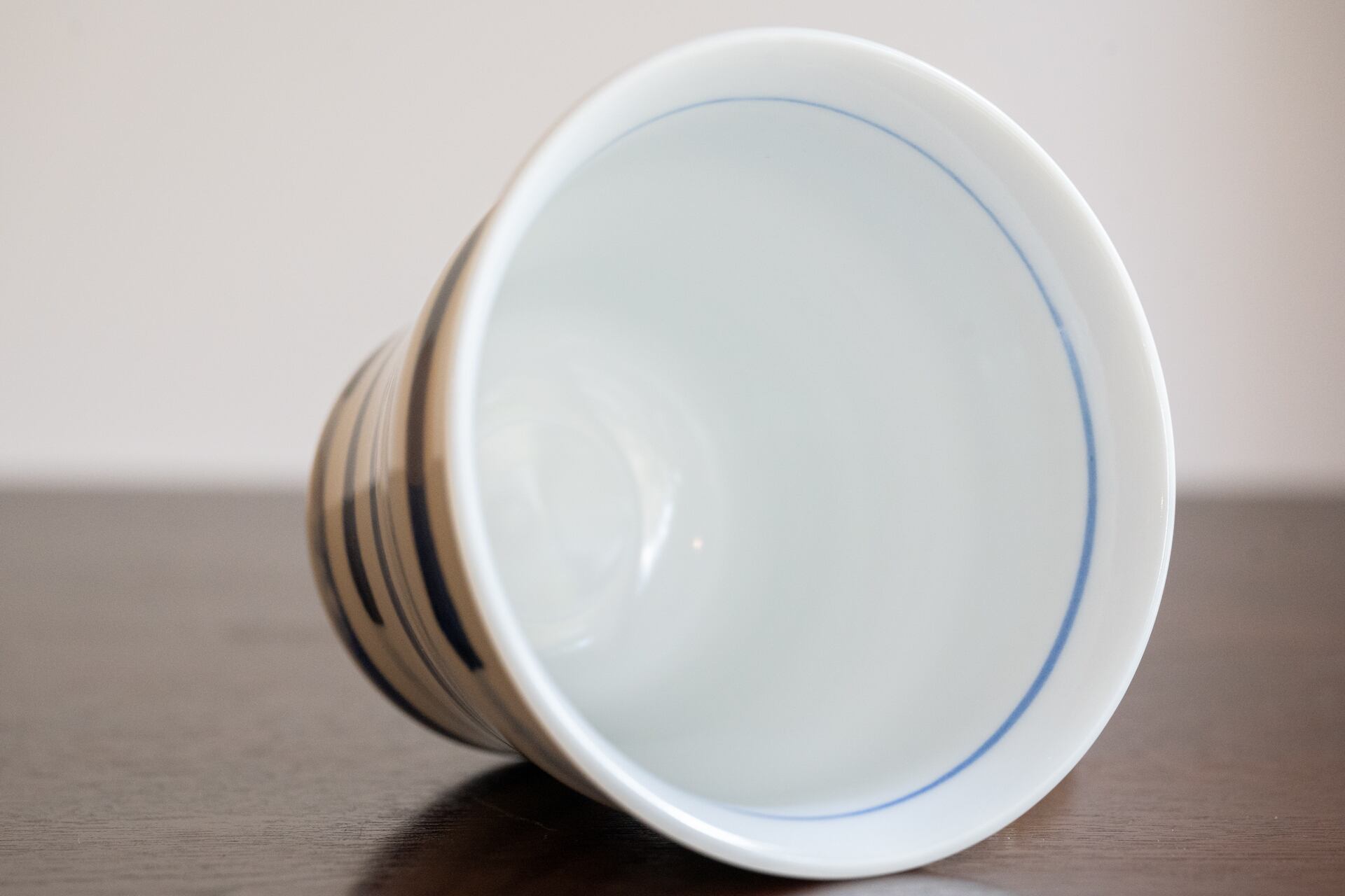 こちらは焼酎カップ。ロックやお湯割にちょうどよい大きさです。口が開いているので飲み物の香りが立ちますし、底にむけてすぼんでいるので手に取りやすく口に持っていきやすくなっています。筆の走りからなる刷毛縞文の色の濃淡が面白いです。